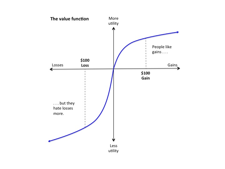 Well, this is where behavioural economics comes in and hence the reference to Thaler’s book. Specifically, there is a particular behavior called loss aversion which describes how humans are keen to eliminate loss altogether since losses hurt twice as much as gain makes you feel good. Figure 1 illustrates this effect.
