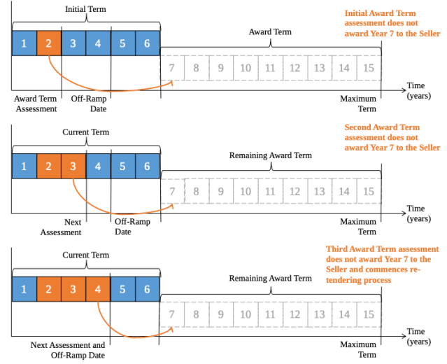 Unlike scenario 1, in scenario 2 the seller is delivering poor performance, behaviours and value. This scenario is shown in the figure below. In year 2 of the contract the buyer undertakes the Award Term assessment process resulting in an unsatisfactory rating. In this case the buyer would not grant any additional contract term beyond the original contract term (i.e. 6 years). During year 3 the seller continues to deliver poor performance, behaviours and value and again is assessed as unsatisfactoryand not grants an additional year of contract term. The original contract term of 6 years remains. Importantly, should the seller be assessed as unsatisfactory in year 4 of the contract the Off-Ramp Date will be reached resulting in an automatic re-tendering activity for some or all the contract scope.