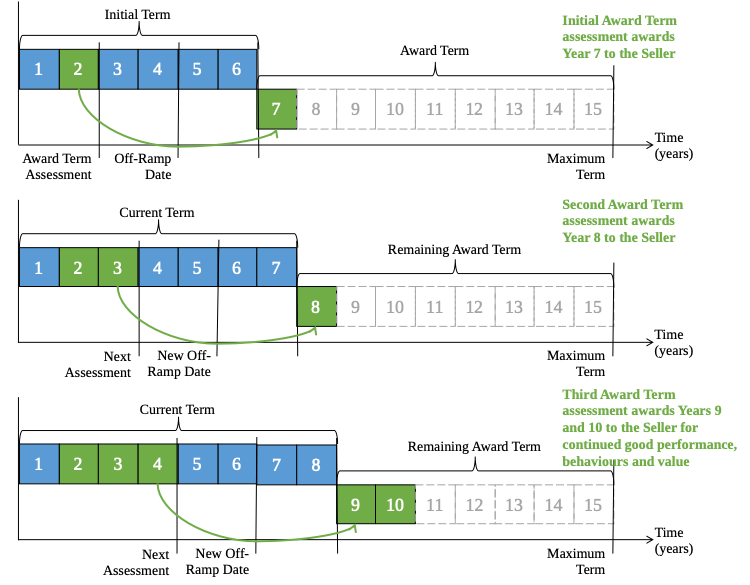 The seller then continues to deliver good performance, behaviours and value and in year 4 again receives a satisfactory rating from the Award Term assessment process with the buyer granting 1 additional year (i.e. year 8) with a new total contract term of 8 years.