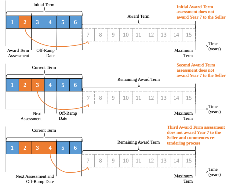 Unlike scenario 1, in scenario 2 the seller is delivering poor performance, behaviours and value. This scenario is shown in the figure below. In year 2 of the contract the buyer undertakes the Award Term assessment process resulting in an unsatisfactory rating. In this case the buyer would not grant any additional contract term beyond the original contract term (i.e. 6 years). During year 3 the seller continues to deliver poor performance, behaviours and value and again is assessed as unsatisfactoryand not grants an additional year of contract term. The original contract term of 6 years remains. Importantly, should the seller be assessed as unsatisfactory in year 4 of the contract the Off-Ramp Date will be reached resulting in an automatic re-tendering activity for some or all the contract scope.