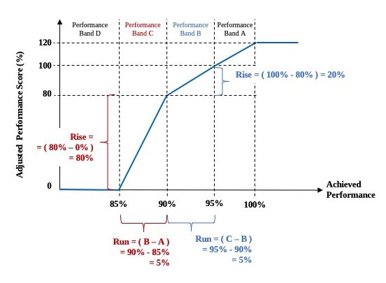 That is, for each 1% increase in the Achieved Performance score from 90% to 95%, the APS would increase by 4%, from 80% to 100%.