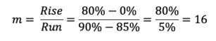 Importantly, you will notice an additional term in the equation above, specifically (APS – 85%). The reason for this is to have the same ‘range’, or distance, that the ‘run’ had in calculating the gradient; that is between 85% and 90%. Therefore, we need to subtract 85% from the Achieved Performance score before multiplying by the gradient.