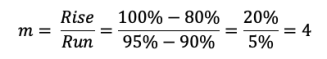 Again, you will notice the additional term in the equation above, specifically (APS – 90%) giving the same ‘range’, or distance, that the ‘run’ had in calculating the gradient; that is between 90% and 95%. Therefore, we need to subtract 90% from the Achieved Performance score before multiplying by the gradient. However, in this circumstance, the APS had a starting value of 80% and therefore we had to add 80% to the final score.